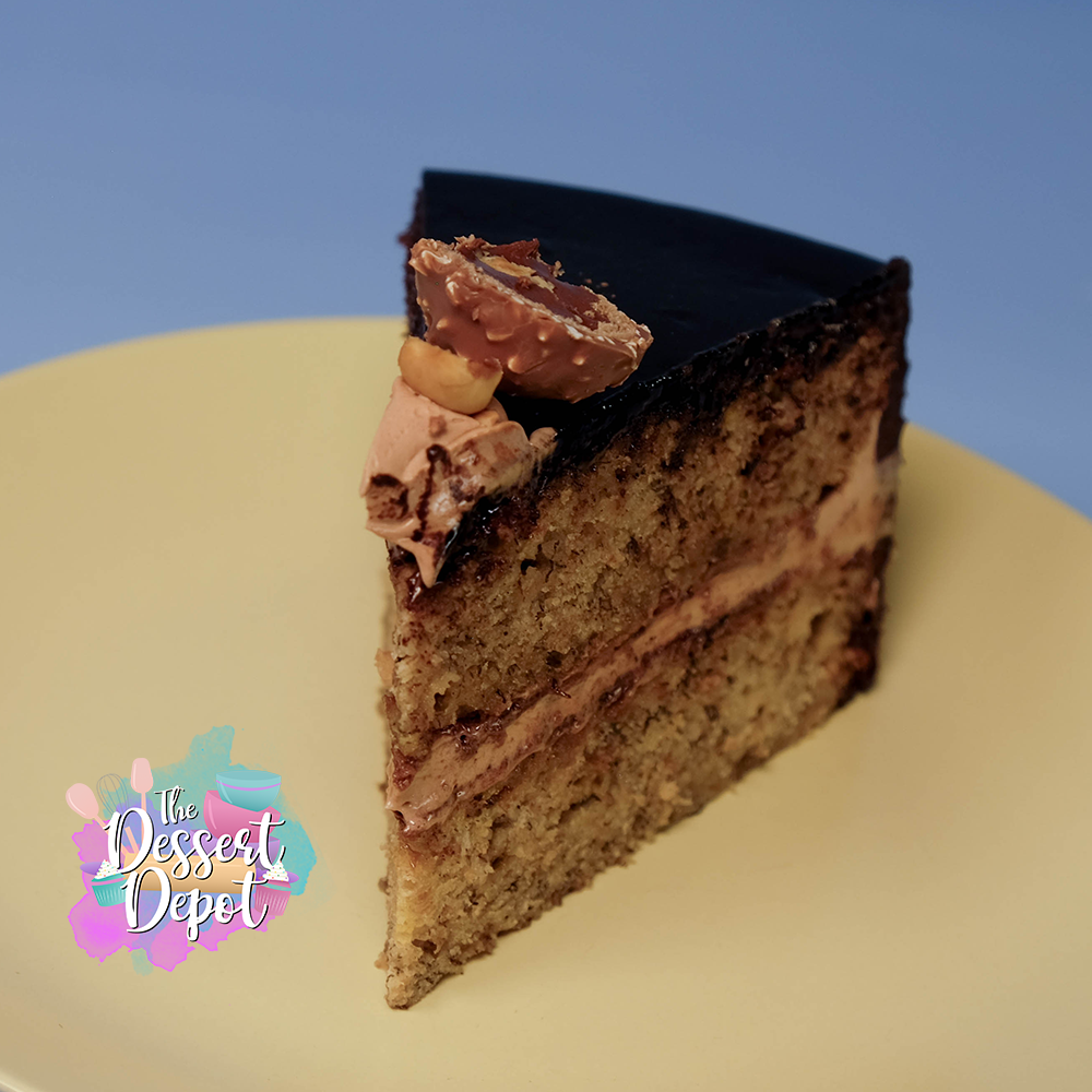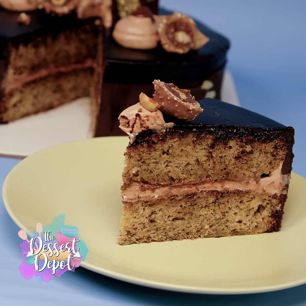 We've taken our super moist banana cake and filled it with creamy chocolate hazelnut mousse for a combo that just works. The whole cake gets covered in smooth dark chocolate that gives it that nice shiny look everyone loves. To finish it off, we add some fluffy hazelnut cream on top and throw on some Ferrero Rocher chocolates.