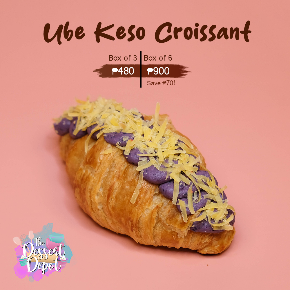 Our freshly baked buttery croissant is filled with pure ube halaya cream cheese and topped with shredded cheese.